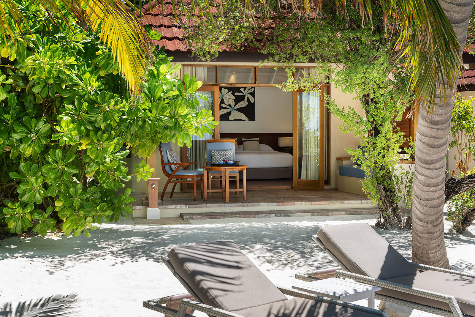 Athiri Beach Bar sits on the serene western edge of the atoll, where every moment glows with sunlit warmth. Soft white sand stretches into a sparkling turquoise lagoon, framed by swaying palms that offer a cool, natural retreat.