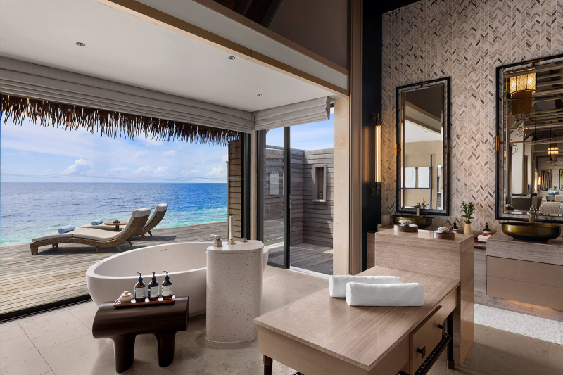 This overwater retreat invites you to the edge of the horizon. A king bedroom and dressing room with a glass floor immerse you in the marine beauty below, and expansive windows open to create a flowing space, revealing sweeping ocean views. Step outside to bask in the sun on your private deck, float in your private infinity pool, and sway gently in your overwater hammock. With elegant interiors and seamless indoor-outdoor living, every detail has been considered to slow time — and soothe the spirit.Waldorf Astoria Maldives